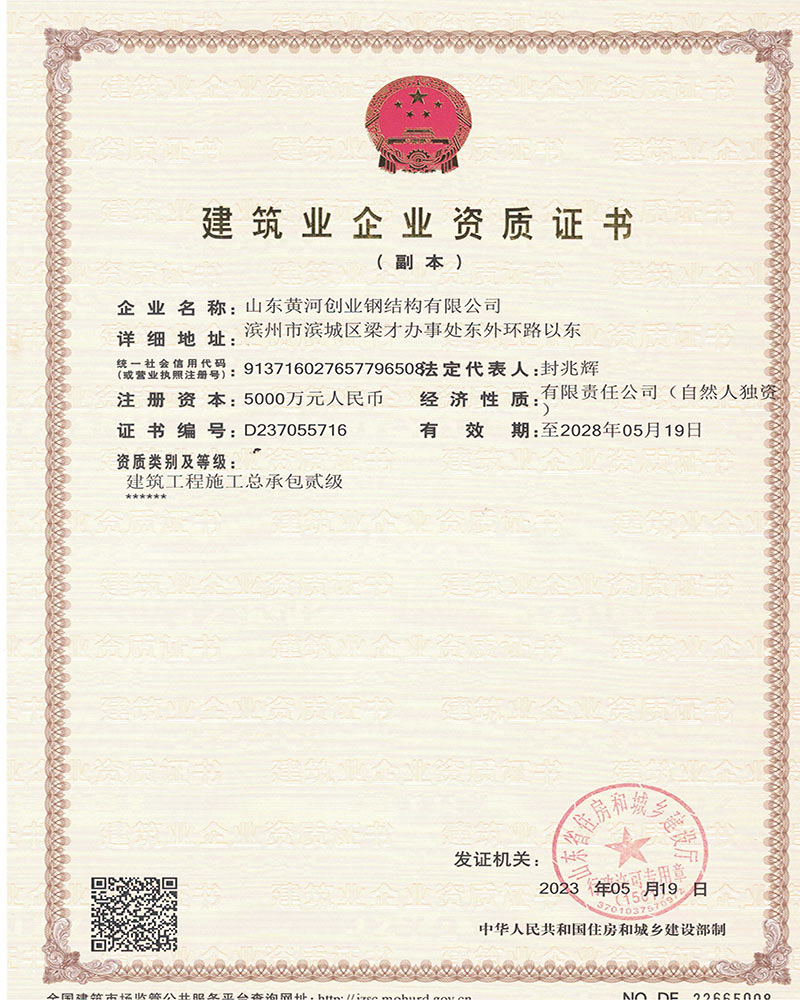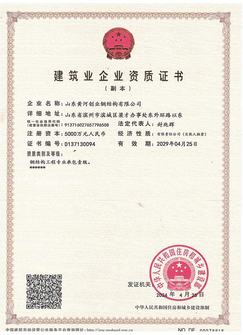 公司為了打造“黃河創(chuàng)業(yè)”品牌,在各級(jí)主管部門的領(lǐng)導(dǎo)下,在激烈的市場(chǎng)競(jìng)爭(zhēng)中,自小至大,自弱至強(qiáng)得到長(zhǎng)足發(fā)展,經(jīng)過不斷努力,公司先后被山東省列為重點(diǎn)工程企業(yè);山東省級(jí)先進(jìn)企業(yè);誠(chéng)信企業(yè);連續(xù)多年被授予濱州市守合同、重信用企業(yè);獲得金融機(jī)構(gòu)信用AA級(jí)證書;濱州市建筑重點(diǎn)企業(yè),2016年度被授予“濱州市建筑重點(diǎn)企業(yè)”、“濱州市建筑優(yōu)秀企業(yè)”、“濱州市建筑業(yè)誠(chéng)信企業(yè)”、“山東省建筑業(yè)誠(chéng)信企業(yè)”,2021年被市局評(píng)為“濱州市鋼結(jié)構(gòu)協(xié)會(huì)主任委員單位”。連續(xù)多年被評(píng)為“突出納稅貢獻(xiàn)戶”。2022年被市應(yīng)急管理局評(píng)為“安全生產(chǎn)標(biāo)準(zhǔn)化三級(jí)企業(yè)”,多年被評(píng)為“濱州市建筑業(yè)協(xié)會(huì)優(yōu)秀會(huì)員單位,形成了“黃河創(chuàng)業(yè)”的品牌,建設(shè)項(xiàng)目參加QC小組競(jìng)賽也多獲得二等獎(jiǎng)、三等獎(jiǎng)。